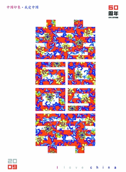 為迎接新中國60周年華誕,該校包裝系教授陳瞻最近特意設(shè)計了這一款海報,其最大的特點遠(yuǎn)看是“囍”,近看又能凸顯出09和60兩個具體的主題,花紋和色彩設(shè)計烘托出喜慶氣氛。