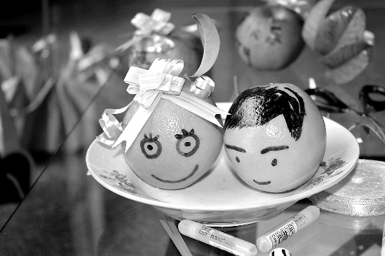 “水果賀卡是種取代傳統(tǒng)紙質(zhì)卡片的新型賀卡,以蘋果、橙子、香蕉等日常水果為材料,用在上面寫字、繪畫、粘貼寫有祝福語(yǔ)的彩色絲帶等方式來(lái)裝扮。”