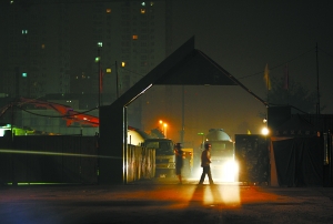 昨天深夜11時許,記者在望京東湖灣小區(qū)東門看到,這里的在建工地?zé)艋鹜,響聲一片,距離已經(jīng)入住的居民樓不過百米遠(yuǎn)。記者隨即繞行到小區(qū)南門發(fā)現(xiàn),一輛掛著“甘”字車牌的水泥攪拌罐車順著坑洼不平的馬路,駛離了工地。此時,工地大門大敞著,工地內(nèi)另一輛水泥攪拌罐車打著雙閃待命,工地中機(jī)械轟鳴聲不絕于耳,還不時地傳出施工車輛“嘀、嘀、嘀”的倒車聲,直至今晨零時記者離開現(xiàn)場時,夜間施工仍未停止。