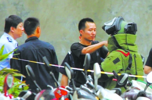 記者在通盛嘉苑斜對面的中北西子花園紫云苑A座9樓,清晰觀察到了排爆情況。警方先后排出排彈機器人、搜爆犬和拆彈專家,接近“炸彈”。下午3點58分,記者發(fā)現(xiàn),民警經(jīng)過幾輪偵察后,似乎放松了許多,上前將黑袋子取走。