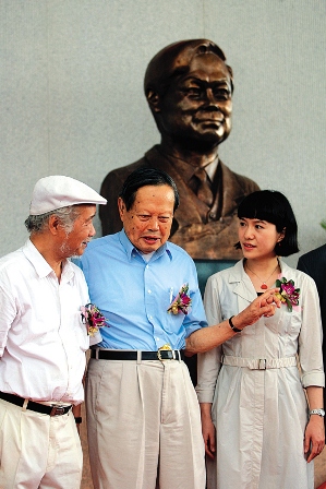 楊振寧1993年成為東莞理工學(xué)院名譽院長,東莞理工學(xué)院請雕塑大師潘鶴為他新建了一座“楊振寧銅像”,安放在學(xué)校圖書館的門口。楊振寧此行就是出席銅像揭幕儀式的。