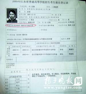 就讀于江蘇教育學(xué)院、今年大四的泰興籍女生沙莎,臨近畢業(yè)時才驚訝地得知,4年前那份證明她“身份”的《普通高等學(xué)校招生考生報名登記表》,“篡改”了她的“身世”,畢業(yè)學(xué)校明明是“江蘇省泰興中學(xué)”的她,被寫成了“泰興市馬甸中學(xué)”。結(jié)合女兒當(dāng)年高考成績“很出乎意料”,昨天,擔(dān)心女兒成又一個“羅彩霞”的沙先生向本報記者反映,“很可能有人在故意篡改檔案”。