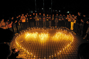 孩子們用400多支白色的蠟燭排列出“錢、學(xué)、森”三個(gè)字,然后用心形的拼圖圍在外面。同學(xué)們圍成一圈,用默哀的方式靜靜悼念逝去的老人。