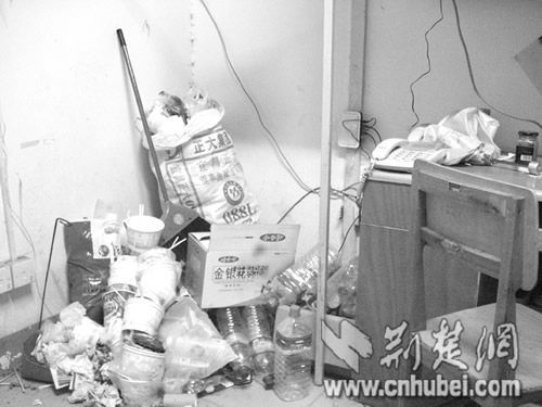 據(jù)記者了解,B棟所住的均為該校的男大學生。這行粉筆字寫在樓道的地上,記者趕到時,字跡已經(jīng)十分模糊了。在知情學生的指引下,記者進入6樓一間寢室。一進門,一陣怪味就撲面而來。四下仔細一看,寢室門后一個高近一米的垃圾堆赫然出現(xiàn)在記者眼前:用過的飯盒、塑料袋,甚至是煙頭、飲料瓶,各式垃圾堆滿一地。但在這種環(huán)境下,寢室里的4個男生卻好像絲毫沒有察覺,上網(wǎng)、看書不亦樂乎。該寢室學生小程告訴記者,他們每天的學習任務都比較重,課余時間一些同學又流連網(wǎng)絡,因此大家平時都不愿意做清潔,寢室里形成這么個垃圾堆也“不足為奇”!安贿^通常我們隔一個月會清除一次的!毙〕陶f,冬天把垃圾堆在寢室里也沒多大關系,夏天會清除得比較及時。而小程所說的“清除”,就是把垃圾從室內(nèi)掃到寢室門口堆放,等宿管做清潔的時候一并清理。“其實我們的生活垃圾是應該自己拿到樓下的垃圾桶里扔掉的,但很多同學為了省事,就直接把垃圾堆在門口,這樣增加了宿管做清潔的勞動量,最后才發(fā)生了她們寫‘大字’抱怨的事情。”
