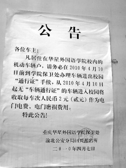 “我們住戶和學(xué)校完全是兩個獨(dú)立個體,學(xué)校根本沒有任何權(quán)力向我們收費(fèi)。”家住華星外國語學(xué)院家屬樓1單元5樓的住戶龍兵生說,本月7日,學(xué)校保衛(wèi)處在大門口通報欄處貼了一則收費(fèi)公告,要求凡居住在校內(nèi)有機(jī)動車輛的住戶務(wù)必在本月10號前到學(xué)院保衛(wèi)處辦理進(jìn)出“通行證”手續(xù),否則將向進(jìn)出校園的無“車輛通行證”的住戶,收取每人每車次2元,作為電門電費(fèi)、電門磨損費(fèi)用。