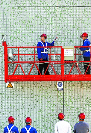 這 93名考生分別由11家保潔公司推薦,都有高層建筑保潔工作經(jīng)驗(yàn),考試之前全部經(jīng)過(guò)100學(xué)時(shí)的培訓(xùn)。43歲的付正會(huì)從事高層建筑保潔工作有十幾年了,鳥巢、水立方的“洗臉”工程都參與過(guò)!跋聒B巢這樣的大項(xiàng)目,要50多人干上半個(gè)月呢!备墩龝(huì)說(shuō),這工作收入不低,但有些危險(xiǎn),干活兒的工人都應(yīng)該經(jīng)過(guò)專業(yè)培訓(xùn)和考試。