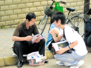 6月7日,高考的第一天。早上7點(diǎn),當(dāng)記者來到蚌埠市懷遠(yuǎn)縣一中大門口時(shí),發(fā)現(xiàn)這里除了正在等候考試的考生和家長,還有很多手里拿著大堆傳單和招生簡(jiǎn)章的年輕人,并不斷地往家長和學(xué)生手里塞。