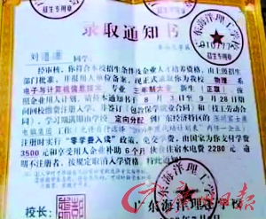 記者發(fā)現(xiàn),這些發(fā)出錄取通知書(shū)的學(xué)校,全部都提出各種各樣令人心動(dòng)的優(yōu)惠條件。像某學(xué)校的錄取通知書(shū)上就寫(xiě)著“零學(xué)費(fèi)入讀”以及“享受用人單位補(bǔ)助的各種優(yōu)惠政策”。明眼人一看,就知道這些錄取通知書(shū)很可疑。