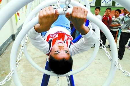 五年級的小學(xué)生徐成林排隊(duì)坐在一個名叫“過山環(huán)梯”的器材上,面朝上躺下,然后憑著手和腳的力量在環(huán)形的器材里,像只小蟲一樣蠕動前進(jìn)。