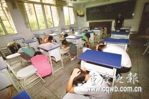 “由于發(fā)生余震,請(qǐng)同學(xué)們迅速疏散,到操場(chǎng)集合!”昨下午3時(shí)50分,一場(chǎng)特殊的高考防震演習(xí)在重慶市八中第二教學(xué)樓舉行。200多名高一學(xué)生在聽到廣播發(fā)出的指令后,快速?gòu)慕淌遗艿讲賵?chǎng)上,整個(gè)過程用時(shí)不到兩分鐘。