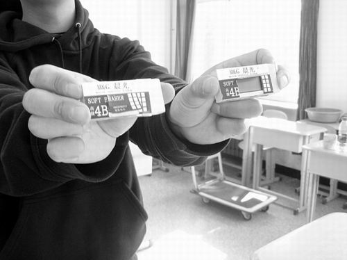 11日上午第一科進(jìn)行的是基礎(chǔ)知識(shí)考試,試題均為客觀選擇題。10點(diǎn),到了規(guī)定的開考一小時(shí)后可以離場(chǎng)時(shí)間,陸續(xù)有考生走出考場(chǎng),但仍有不少考生仍在埋頭認(rèn)真答卷。但一名女考生卻引起監(jiān)考人員注意。她不看試卷,卻不時(shí)擺弄手中的橡皮。橡皮有什么好玩的?監(jiān)考人員走上前去,拿起橡皮端詳。這塊標(biāo)有“晨光”牌的橡皮十分常見,外觀上看沒什么特別,但其外包裝紙卻有被揭開的痕跡。監(jiān)考人員揭開包裝紙,竟然發(fā)現(xiàn)這是一個(gè)類似微型BP機(jī)的接收設(shè)備,上面正顯示出各試題的答案。