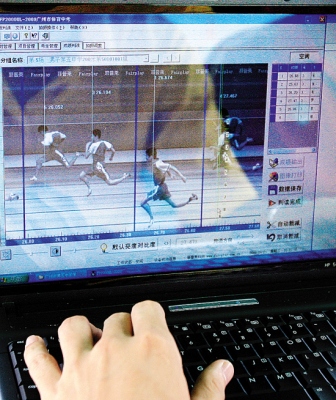 在五中的200米跑賽道上,起點處多了兩個黑盒子,終點處則有一個高臺,一個攝像鏡頭時刻對準終點線,當學生們沖過鏡頭前的一剎那,高臺上的工作人員就可以從電腦上看到清晰的沖線照片!捌鹋芫的兩個黑盒子其實是傳感器,當學生過線時,通過電磁波發(fā)射,令電腦系統(tǒng)開始計時,”操作電動計時儀的工作人員告訴記者,“終點線前的高速攝影機可以精確到1/1000秒,拍出非常精細的圖像,讓每個學生的成績誤差降到最小!