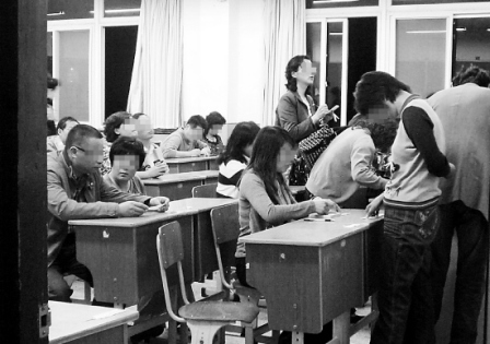 教學(xué)點(diǎn)的墻上貼著一些學(xué)生的進(jìn)步成績表,一名男咨詢員指著其中一個(gè)高三學(xué)生的名字說,這個(gè)孩子全科補(bǔ),不在學(xué)校晚自習(xí)了,家長為此已投入7 萬多元!盀榱撕⒆拥膶,投入還是值得的!彼f,“孩子在學(xué)校晚自修效率不高,學(xué)校老師要管很多學(xué)生,如果你孩子不主動(dòng),老師也很難顧及到!