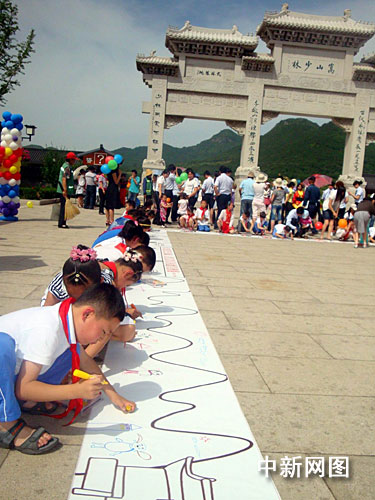 在游客中心廣場, 60名兒童正在廣場描繪四幅十米長卷,以“六一、我在少林放飛心中的童話夢想”為主題,這 60名少年兒童在1個(gè)小時(shí)時(shí)間內(nèi),進(jìn)行色彩內(nèi)容的填充,共同將少林及動(dòng)漫描上未來的色彩,再現(xiàn)心中的傳奇少林。