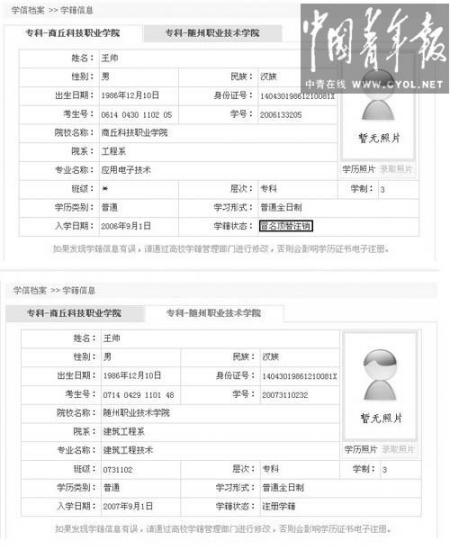 從學(xué)籍科老師處知道自己的身份可能被盜用的消息后,王帥登錄中國高等教育學(xué)生信息網(wǎng)查詢。他發(fā)現(xiàn)自己的身份下有兩個學(xué)籍信息,一個是自己2007年入學(xué)的隨州職業(yè)技術(shù)學(xué)院,另一個則顯示為:2006年9月1日入學(xué)商丘科技職業(yè)學(xué)院工程系應(yīng)用電子技術(shù)專業(yè),學(xué)制三年?,學(xué)籍狀態(tài)為已畢業(yè)。后者的姓名、出生日期、身份證等信息均與自己相同,考生號則為自己第一年參加高考的準(zhǔn)考證號。兩個學(xué)籍信息均沒有照片。