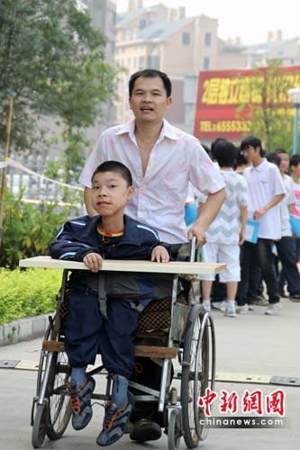 中新網(wǎng)宜昌6月20日電(記者 劉良偉 上官純青)20日,湖北宜昌7.7萬名學(xué)子參加了當(dāng)?shù)氐闹锌,這其中有一位特殊的孩子——宜昌市十五中905班的王宇,在父親的陪伴下,來到當(dāng)?shù)貙iT設(shè)立的特殊考生考場參加了考試。十多年來,父親王忠(化名)為患有罕見的肌肉營養(yǎng)不良癥的王宇,和妻子沒有放棄,用人間真愛一路陪伴著兒子,無論風(fēng)吹雨淋,他都執(zhí)著地背孩子上學(xué),并自己鉆研醫(yī)學(xué),以身試藥,用真心真愛演繹著平凡人生里不朽的傳奇。