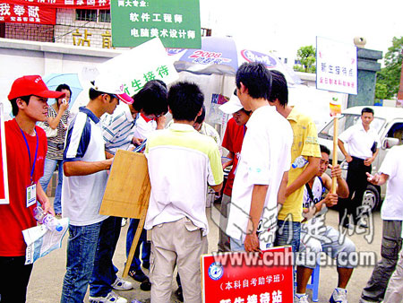 記者從其中一處咨詢點起身后,沒走上幾步,立即圍上四五名招生人員,爭相介紹自己的學校,均稱自己是重點大學的正規(guī)自考招生。其中一名招生人員向記者推介:“他們有的雖然掛個大學的牌子,其實是在外面租房子教學,而我們是在校本部辦學!泵鎸谏磉叺恼猩藛T,記者表示,要單獨考慮對比一下再決定,但仍有3人緊跟不舍。他們表示,高考分數(shù)并不重要,兩三百分都可以報名。