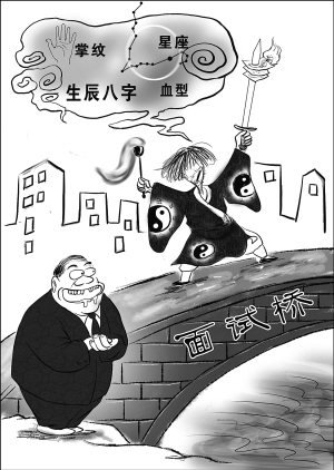 找工作面試,要先經(jīng)“相面先生”看面相看掌紋;能否錄用,要由血型說了算;是否適合職位,得計算一下星座和生辰八字再說。過了“金九銀十”的網(wǎng)上申請、網(wǎng)上投簡歷高峰,11月起應(yīng)聘面試進(jìn)入高峰期,不少求職者在面試中屢屢遇到新招怪招,讓人“看不懂”。