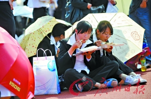 也有同學(xué)通過“暗號(hào)”聯(lián)系,如“某學(xué)院經(jīng)管班‘最佳射手’請(qǐng)到主席臺(tái)”,估計(jì)被呼叫的同學(xué)是個(gè)足球愛好者。也有同學(xué)搞惡作劇。當(dāng)廣播中有同學(xué)尋找周杰倫時(shí),全場(chǎng)一陣笑聲。還有這樣的廣播,“麻省理工大學(xué)的××同學(xué)請(qǐng)到主席臺(tái),您劍橋的同學(xué)在等您”,這在緊張的氣氛中制造了難得的笑聲! ∥/記者 徐靜 圖/記者 邵權(quán)達(dá)