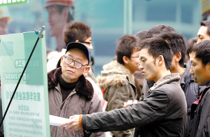 農(nóng)民工專場招聘會,吸引了不少應(yīng)屆大學(xué)畢業(yè)生前來應(yīng)聘。他們對第一份工作的月薪期望,在1000元左右,與不少有一技之長的農(nóng)民工相比,少了一半。