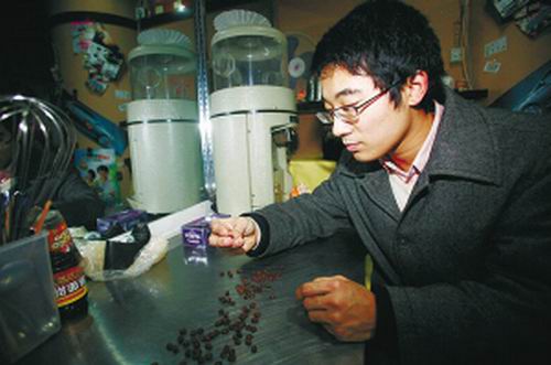 陳寅嵩展示他購(gòu)買(mǎi)到的哥倫比亞咖啡豆。記者 張曉 攝