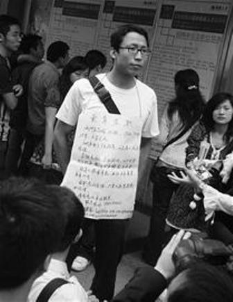 4月26日,一位身著淺藍(lán)色T恤、戴著黑邊眼鏡的男青年出現(xiàn)在成都市寧夏街人才市場門口。他的穿著打扮很普通,胸前掛的一塊“賣身求職”的牌子卻十分醒目,引來眾人圍觀。從這塊白紙紅字的牌子上可以得知,這名男子叫王志強(qiáng),今年25歲,身高1.75米,大學(xué)文化。2005年他南下廣東,干過兩年管理工作。由于金融危機(jī),企業(yè)倒閉,所以“現(xiàn)賣身求職,要求年薪至少10萬元!