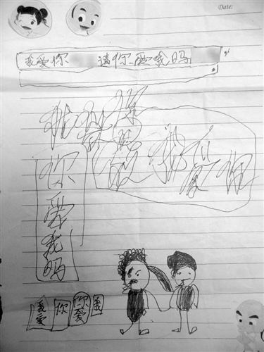 “我愛你王××,你愛我嗎!”從筆記本撕下的紙張上端整齊地寫著一行字,字被框了起來(lái),比較醒目。紙張下端,畫著一個(gè)獨(dú)辮子女孩和一個(gè)男孩牽著手,一旁標(biāo)注著“我愛你,你愛我”。