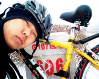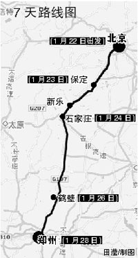 由于沒有買到回老家鄭州的火車票,北航的大二學(xué)生高富松決定騎自行車回家。他1月22日從北京出發(fā),歷時7天抵家,目睹了冰雪對沿途居民的影響。昨天,高富松興奮地告訴記者,雖然路上經(jīng)歷了不少困難,但堅持到最后的精神讓自己平安到家,而且這次經(jīng)歷也考驗了自己的耐力。
