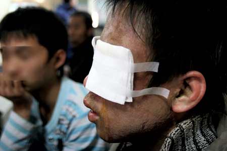 中日聯(lián)誼醫(yī)院的值班醫(yī)生說,傷者臉部、脖頸等多處被燒傷,臉部已經(jīng)被毀容,眼睛已經(jīng)看不清任何物體,因為沒有錢,目前只做了常規(guī)的檢查,從被傷害的程度看,如果不能及時治療,隨時有失明可能。聽到這個消息,時東旭的情緒有些激動,“我才18啊,我不想瞎!”雖然眼睛被紗布蒙住,卻沒有擋住時東旭的淚水。