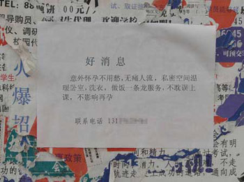 “科學(xué)人流”“無(wú)痛人流”“內(nèi)窺式可視人流系統(tǒng)”……當(dāng)這些關(guān)鍵詞支撐的廣告宣傳單在國(guó)內(nèi)正以潤(rùn)物細(xì)無(wú)聲的方式日漸入侵各城市大學(xué)校園的時(shí)候,日前,一幅宣傳“無(wú)痛人流”的巨型海報(bào)赫然懸掛在山西省大同市某高校門口的住宅樓上。如此看似“有針對(duì)性”的行為再度引發(fā)爭(zhēng)論:是誰(shuí)讓人流廣告入侵了大學(xué)校園?