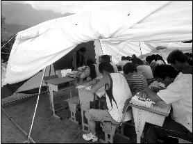 昨天下午,茂縣中學(xué)操場(chǎng)上架起了8個(gè)巨大的白色帳篷,帳篷上印有聯(lián)合國(guó)兒童基金會(huì)的藍(lán)色標(biāo)志。每頂帳篷里都坐滿了高三學(xué)生。為了散熱,帳篷兩側(cè)都被撩起來通風(fēng)。4點(diǎn)剛過,喧鬧的帳篷內(nèi)頓時(shí)安靜下來,其中一個(gè)帳篷里不久后傳出了一片讀書聲。旁邊的“教室”內(nèi)學(xué)生們安靜地做著卷子。記者悄聲問坐在帳篷邊的一位女生上什么課,她悄聲回答:“地理。”