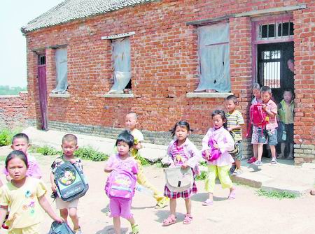 “學(xué)校只有一棟兩層只能容納8個班的教學(xué)樓,學(xué)前班和一至六年級占去7個教室,多媒體遠程教 室和辦公室合占一個教室。幼兒班的34個孩子沒處上課,晴天就在 3間破瓦房里湊合,雨天就停課。”陳海玉老師說。幼兒班上課的3間破瓦房,房頂明顯下陷,破舊的教室門上橫七豎八地釘著幾個木板擋住窟窿,窗戶上已經(jīng)沒有玻璃,墻體上多處有明顯裂縫!昂⒆釉诶锩嫔险n太嚇人了。”在該校門口,前來接孫子的73歲老人李繼剛說,“房子是上世紀70年代末蓋的,娃子在里面上課,家長天天擔心!