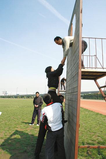 翻越營救墻項目,模擬前有高墻、后有追兵的情境,每個人都必須翻越過3米高的求生墻,大家必須相互協(xié)作,一個先上到墻頂,負責(zé)拉下面的人,有的還要負責(zé)擔(dān)當(dāng)“人梯”。