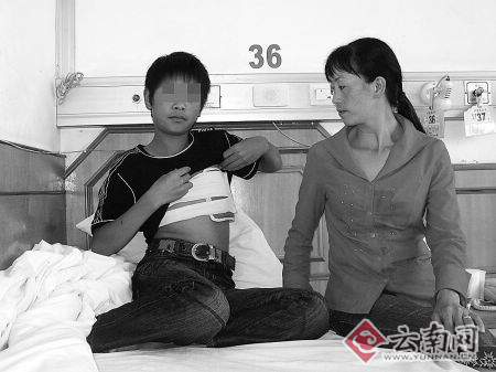 據(jù)阿強(qiáng)回憶,今年6月12日晚,他在文山南鷹學(xué)校內(nèi),因多了一句嘴即被其班主任陳老師痛打。當(dāng)日晚9點(diǎn)多,晚自習(xí)后,阿強(qiáng)和其他同學(xué)一起回宿舍拿洗漱工具到水管處洗臉腳,后按常規(guī)到校內(nèi)一斜坡空地集合接受老師清點(diǎn)人數(shù)時(shí),班主任陳老師宣布還要進(jìn)教室上自習(xí),有幾名學(xué)生因此不滿,阿強(qiáng)也跟著叫了一句:“如果這樣補(bǔ)晚自習(xí)的話,那還不如每天晚上都到12點(diǎn)鐘才睡覺!彪S即遭到陳老師一陣痛打……“我當(dāng)晚睡覺就感到左胸部疼了!”阿強(qiáng)告訴記者:“我被打的第二天,因?qū)W校按常規(guī)放假即回了遠(yuǎn)在西疇的家,回家后也不敢和父母說被老師痛打的事;返回學(xué)校后,我告訴陳老師我被他打的部位還疼,陳老師告訴我要過一段時(shí)間才會(huì)好!敝敝6月23日,阿強(qiáng)疼得受不了,才向老師提出要打電話叫母親來接他離校檢查,后經(jīng)同意才得以向家人說出實(shí)情……