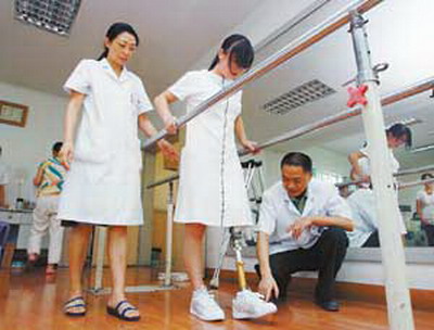 楊鳳在幾個(gè)北川中學(xué)學(xué)生中,是肌肉恢復(fù)訓(xùn)練最為理想的一個(gè),在裝上從德國進(jìn)口的定制假肢后,她已經(jīng)進(jìn)行了三天訓(xùn)練。她最大的愿望是裝上假肢,仍能重跳校園舞。