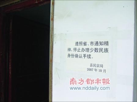 在民宗局辦公室的門口處,張貼著落款為“2007年10月”的一份告示,“遵照省、市通知精神,停止辦理少數(shù)民族身份確認手續(xù)!迸砹f,這是因為找她們辦民族變更手續(xù)的人很多,“很煩,就在門口貼了這張公告!