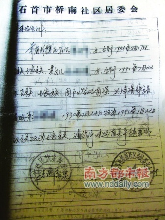 7月18日下午,石首市繡林辦事處槐樹堤居委會辦公室張會計回憶,2006年7月25日,一名婦女曾找到她,請居委會開具一份證明,這名婦女還找來了一位熟人,以證明她的身份。由于有熟人介紹,她便蓋了公章。