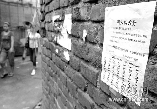 聲稱只要交錢,就可更改大學英語四六級考試的分數(shù)。昨日,記者發(fā)現(xiàn),這樣的涮人廣告,還在多個高校招搖撞騙。