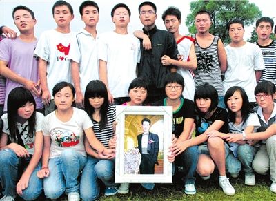 在孩子們排成兩行的弧形隊列里,居于中心位置的是一個很特別的“老師”,“他”不是一個有血有肉的人,而是一個彩色畫框。畫框里,身材頎長的他,打著領結,戴著眼鏡,笑意盈盈,神采飛揚。他叫何海平,是這個完整存活下來的北川中學初三(4)班的班主任、英語教師。而今,他的學生們一個個都還活蹦亂跳的,他卻永遠地走了。