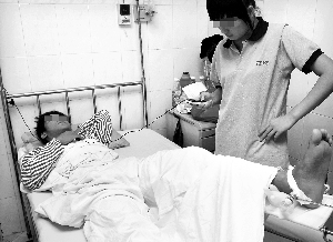 記者在病房?jī)?nèi)看到了這名留院治療的學(xué)生。他的左小腿纏著厚厚的繃帶,疲憊地躺在病床上,面對(duì)外人問(wèn)話一言不發(fā)。記者從診斷書(shū)上看到,這名學(xué)生叫鄭×,18歲,左脛腓骨中下段骨折。陪護(hù)同學(xué)后來(lái)告訴記者,他們是07級(jí)藥物制劑班的學(xué)生,班上共7名學(xué)生因打架受傷入院,其中6人輕微皮外傷,在包扎后都已回校。