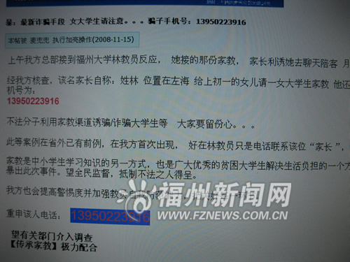 吳同學(xué)將情況反映給師大傳承家教中心。15日傍晚,在福州便民論壇,一則標(biāo)題加亮的帖子《最新詐騙手段,女大學(xué)生請(qǐng)注意,騙子手機(jī)號(hào)……》發(fā)布。帖子寫著:“上午我方接到福州大學(xué)教員反映,她接的家教,家長(zhǎng)利誘她去聊天陪客,月薪上千。經(jīng)核查,該家長(zhǎng)自稱姓林,家住左海附近,給上初一的女兒請(qǐng)一名女大學(xué)生當(dāng)家教。他還特意強(qiáng)調(diào)要家庭貧困的女大學(xué)生,該家長(zhǎng)手機(jī)號(hào)為139xxxxxxx6”。該帖子也寫明了他們之所以曝光該家長(zhǎng)手機(jī)號(hào)碼的原因:“我們不想讓女生被不法之徒玷污!