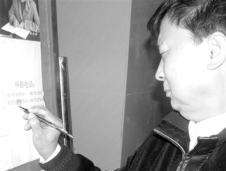 在高坪區(qū)教育局辦公大樓一樓大廳右側(cè),擱了一塊公示欄。公示欄中央,寫著“082次自考公示欄、南充市高坪區(qū)高等教育自學考試委員會辦公室”等黃底黑色大字。公示欄上面粘貼的內(nèi)容有四川省第082次自學考試高坪區(qū)高坪中學考點二區(qū)考點考場安排表等,在公示欄右側(cè)中央,是舉報電話及單位:舉報電話:高坪區(qū)自考辦:0817333××××。南充市看破考辦:0817222××××。為了引起考生注意及顯示自考的嚴肅性,舉報電話及單位的字體很大,一目了然。