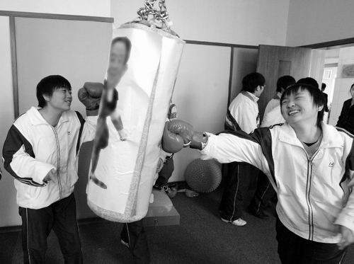25日,記者走進陽光心靈驛站,黃色和藍色相間的墻面讓這個房間顯得格調(diào)平和而優(yōu)雅。驛站由陽光工作室、心理宣泄室、心理放松室三部分組成。站內(nèi)還提供了諸如宣泄皮人、臉譜、放松球、沙袋及拳擊手套等宣泄工具,配備專業(yè)教師7名。記者注意到,該校分管學生的副校長孟凡祥和3位級部主任的頭像也上了沙袋,學生們打起來毫不手軟。