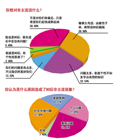 “難道靠個(gè)性就能吃飽飯,作為80后,看到你們非主流一族我很沉痛!本W(wǎng)友“彩虹星星”在給90后非主流的忠告這一項(xiàng)中如此說(shuō)道。“真的對(duì)你們沒(méi)有偏見(jiàn),只希望你們趕快成熟,做事不要由著性子來(lái),追求潮流也要繼承前人的好傳統(tǒng)呀!”在調(diào)查中,網(wǎng)友們對(duì)90后寄予希望,勸他們能多學(xué)知識(shí),讓自己成熟起來(lái),別再出現(xiàn)非主流行為。