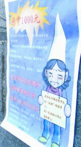 圖中有兩個圖案很“刺眼”:一個是黃色的爆炸圖形上寫著“懸賞1000元”;另一個是占到整張舉報告示近一半面積的女教師形象。