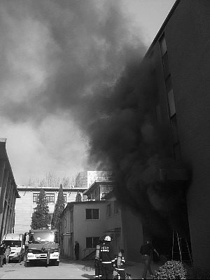 現(xiàn)場(chǎng)消防員稱,趕到時(shí),濃煙從該樓一層三、四米寬的大門口翻滾而出,整個(gè)大廳全是黑煙,能見(jiàn)度很低。幾十名師生站在樓門前。