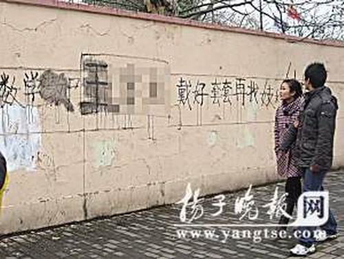 昨天是新學期的第一天。然而,離南京市第十二中學不到300米的一處圍墻上被人用墨水書寫惡毒的話語,辱罵該校一名即將退休的數(shù)學老師,言語不堪入目。該校校長得知消息后,立即帶人用石灰膏涂去了學校名字和老師的名字,然后報了警。目前,警方已經(jīng)介入調(diào)查。