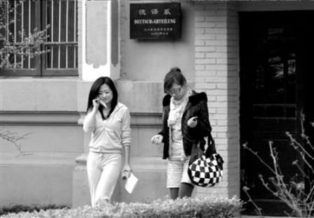昨天下午4點46分,王亭亭站在北外的校門口,身邊跟隨著一位衣著時尚、戴著墨鏡的女士。幾個北外的學生當即認出了她,王亭亭身穿的粉色套裝和博客上的照片一模一樣,照片中染色的卷發(fā)已經拉直并且染成黑色,表情有些冷漠,并不顧及旁人的目光,低頭直接走進離北外校門不足200米的德語系辦公樓。