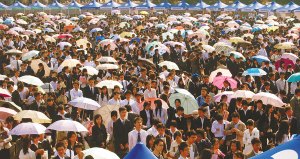 有了前兩天的經(jīng)驗,許多女生帶了拖鞋和折疊凳來(它們和遮陽傘一起被稱為“求職三寶”),管它和筆挺的西裝配不配。等到快到自己了,再換上高跟鞋,又是漂亮的“準(zhǔn)白領(lǐng)麗人”。夏楊、陳輝、余蓉蓉、方瑋