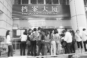 中國證券報(bào)記者在檔案大廈四樓業(yè)務(wù)大廳看到,一間100平方米左右的房間開設(shè)了7個(gè)服務(wù)窗口,每個(gè)窗口前都擠滿了人。而在檔案大廈外面,沒能排到號的市民遲遲不愿離去,任憑保安反復(fù)解釋,人群仍是相當(dāng)激動。